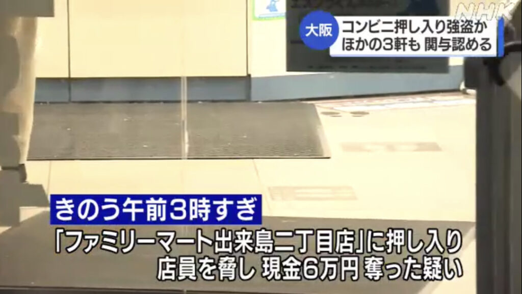 1: ぐれ ★ 2023/02/13(月) 09:48:10.80 ID:Fn5ZljtH9 >>2月12日 11時38分 NHK 11日、大阪・西淀川区のコンビニエンスストア4軒に刃物を持った男が押し入った事件で、警察は、このうち1軒から現金を奪ったとして、20歳の容疑者を強盗などの疑... -