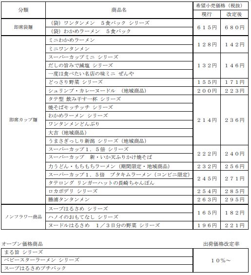 「焼きそばモッチッチ」「わかめラーメン」各シリーズは214円から、236円に値上げ。