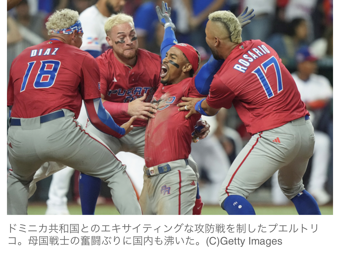 現地3月15日に行なわれたマイアミで行なわれた1次ラウンド・プールD第4戦のドミニカ共和国代表で、プエルトリコ代表は5対2で勝利。勝者が準々決勝に駒を進めるビッグゲームを制していたのだが、この試合を放映した地元放送局『Wapa Deportes』の視聴率はなんと61%(!)。地元紙『Primera Hora』によれば、「史上最高の数字になった」という。