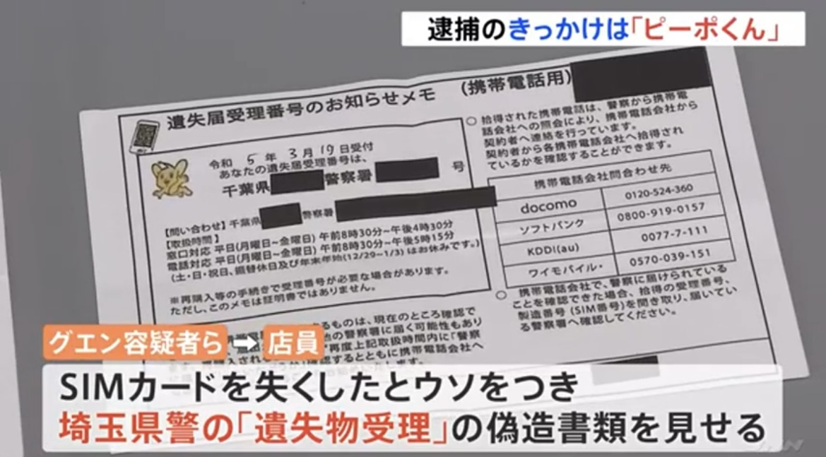 警視庁によりますと、グエン容疑者らは店員に対してSIMカードを失くしたとうそをついた際、埼玉県警の「遺失物受理」の偽造書類を見せましたが、そこに警視庁のマスコット「ピーポくん」がプリントされていたため、不審に思った店員が通報したということです。