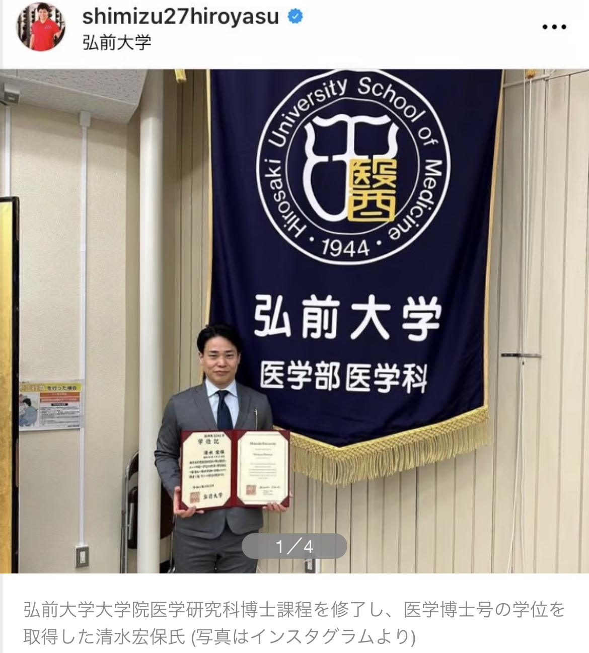 長野五輪男子スピードスケート500メートル金メダリストの清水宏保氏(49)が23日、自身のインスタグラムを更新。同日、青森の国立大学・弘前大学大学院医学研究科博士課程を修了し、医学博士号の学位を取得したことを報告した。