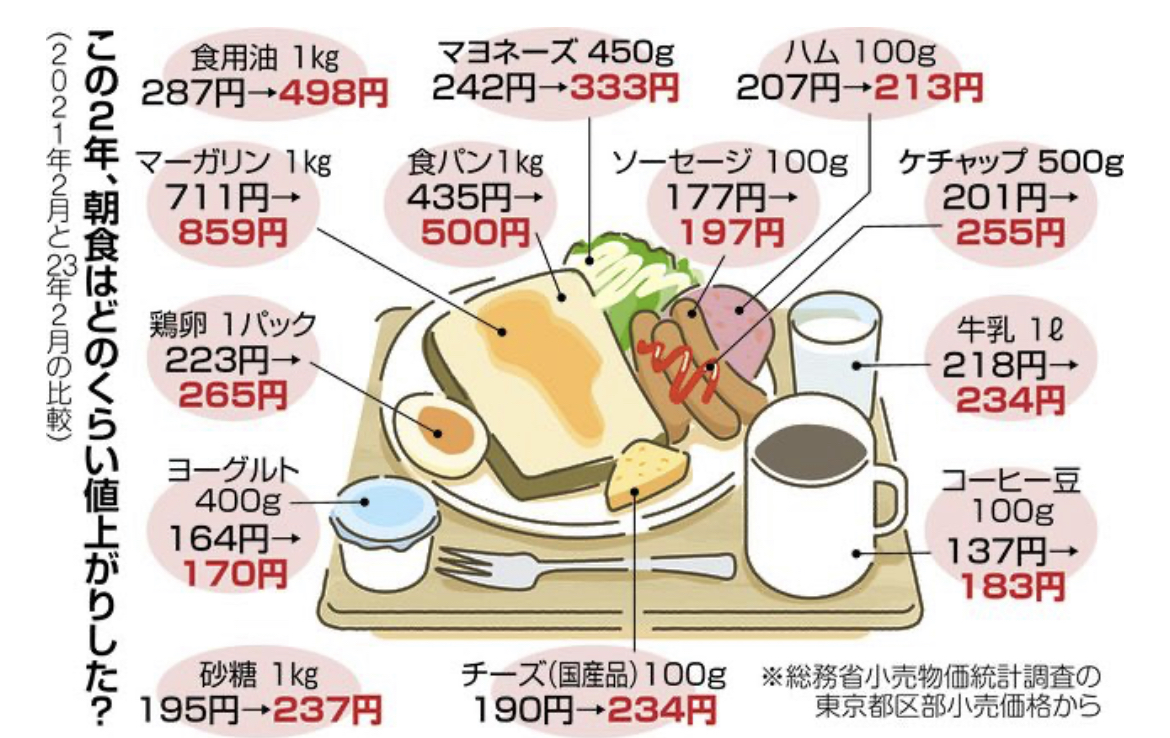 値上げの波は落ち着く気配がない。再値上げも広がる。この2年間で私たちに身近な食品は、どのぐらい上がったのか。朝食メニューで比べると、負担の大きさが浮かび上がってきた。