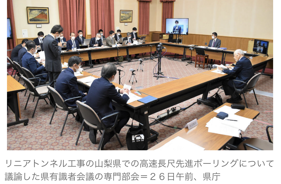 リニア中央新幹線トンネル工事を巡る大井川水問題について協議する県有識者会議の地質構造・水資源専門部会が26日、静岡県庁で開かれた。JR東海は、山梨県内で静岡県境に向けて実施している高速長尺先進ボーリングで、静岡県内の地下水が流出する可能性を初めて認め、水の戻し方や戻す方法を県と議論する方針を示した。