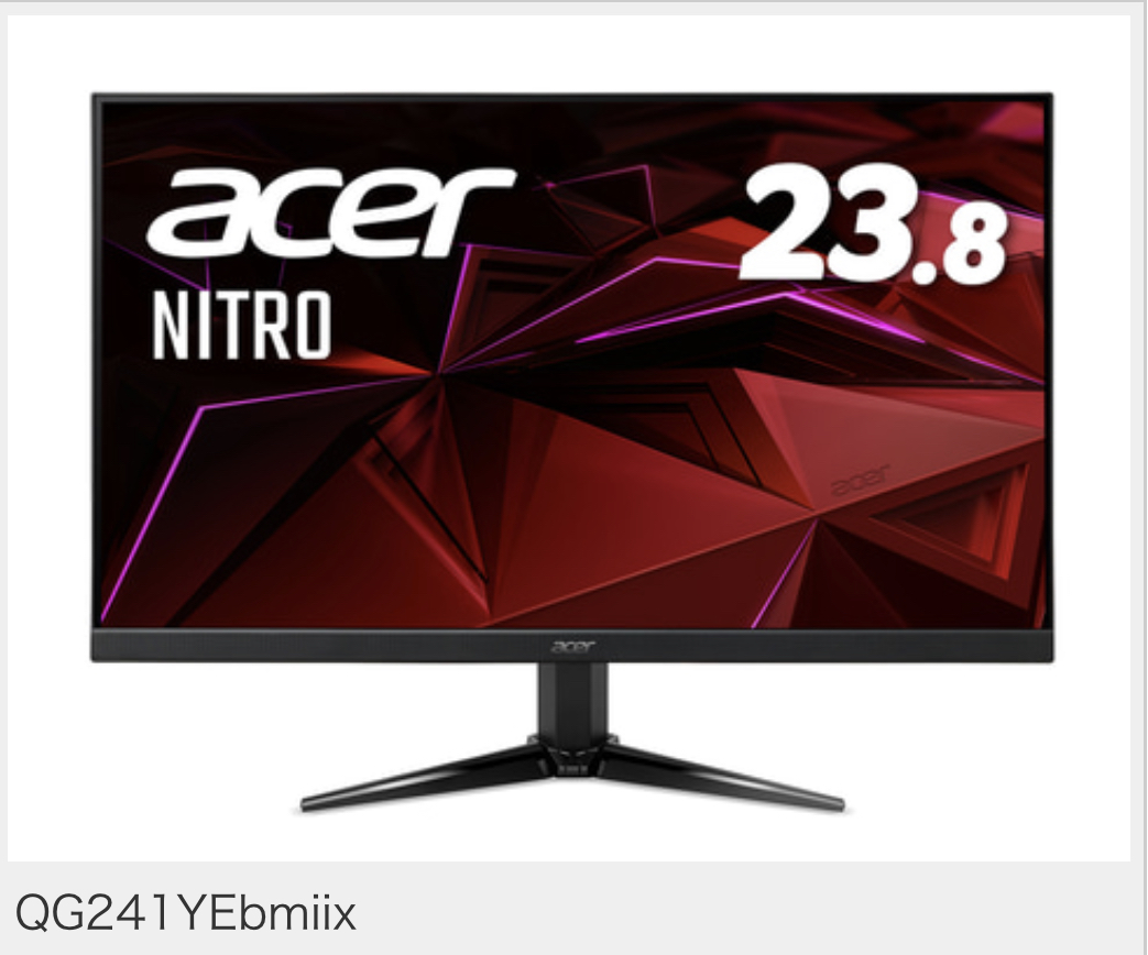 「QG241YEbmiix」は23.8型IPSパネルを採用し、実売予想価格は1万8,000円前後の見込み。主な仕様は、解像度が1,920×1,080ドット(フルHD)、表示色数が約1,670万色、色域がsRGB 99%、応答速度が1ms、コントラスト比が1,000:1(最大1億:1)、輝度が250cd/平方m、視野角が上下/左右ともに178度。本体サイズは約540.3×211.3×412.1mm、重量は約3.1kg。