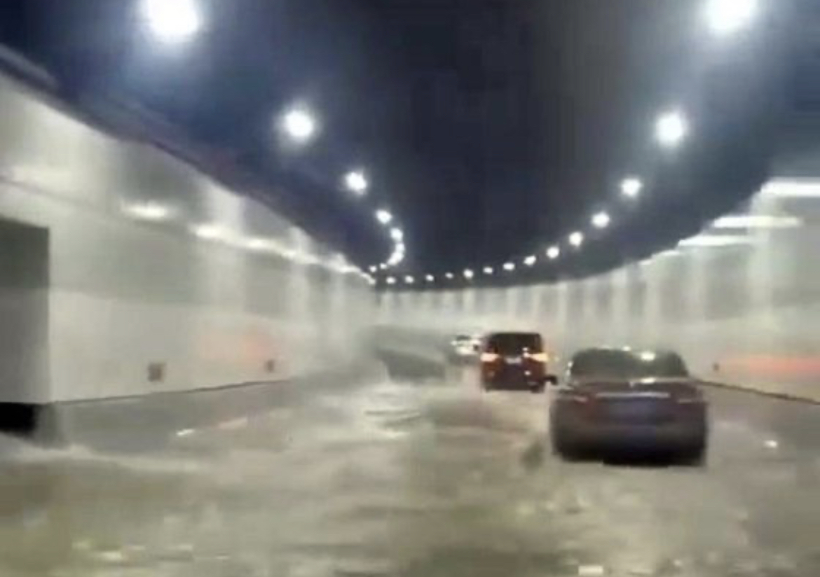 中国のソーシャルメディア(SNS)微博にもトンネル内の道路に水が入っていて、車両の通行に支障をきたす映像が複数投稿されている。