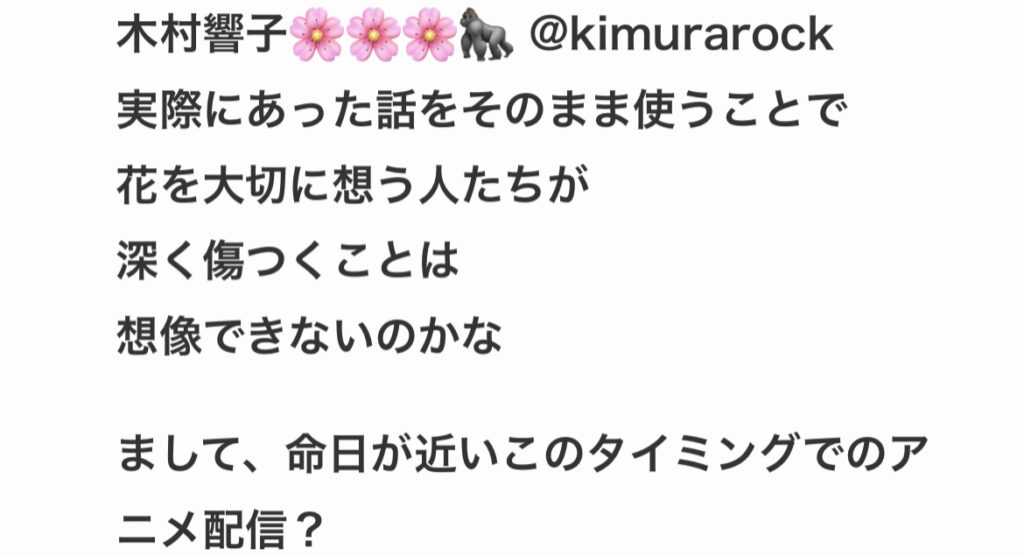 1: アルストロメリア ★ 2023/05/21(日) 14:31:31.01 ID:YQmUhstD9 木村響子🌸🌸🌸🦍 @kimurarock 実際にあった話をそのまま使うことで 花を大切に想う人たちが 深く傷つくことは 想像できないのかな まして、命日が近いこのタ... -