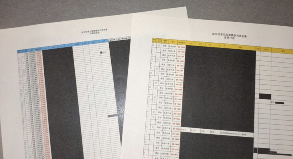 安倍氏国葬参加者名簿、黒塗り
