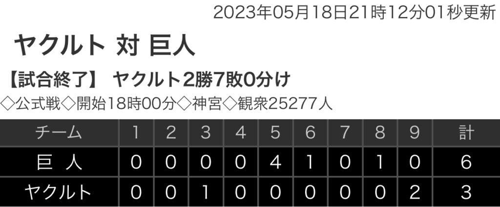 1: 鉄チーズ烏 ★ 2023/05/18(木) 21:11:36.69 ID:kMGAyyPy9 巨人 0 0 0 4 1 0 0 1 0 |6 ヤクルト 0 0 1 0 0 0 0 0 2 |3 【バッテリー】 (巨)横川、菊地、田中豊、高梨、三上 - 大城卓 (ヤ)サイスニード、大西、梅...