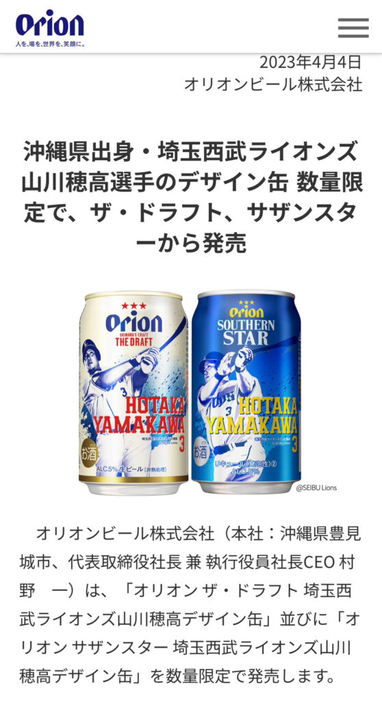【野球】西武山川のオリオンビールCMがYouTubeで閲覧不可に