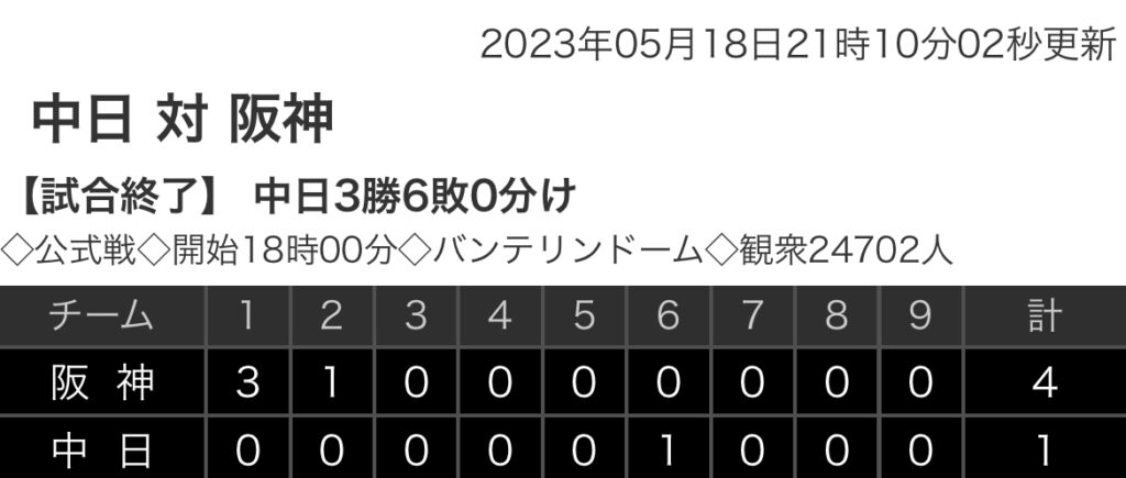 1: 鉄チーズ烏 ★ 2023/05/18(木) 21:07:07.07 ID:kMGAyyPy9 阪神 3 1 0 0 0 0 0 0 0 |4 中日 0 0 0 0 0 1 0 0 0 |1 【バッテリー】 (阪)伊藤将、岩貞、浜地、岩崎 - 坂本 (中)柳、福 、藤嶋、マルティネス- 加藤匠... -
