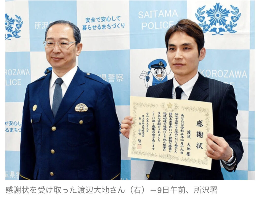 1: ぐれ ★ 2023/05/15(月) 20:03:46.04 ID:Ko/vZO/09 >>5/14(日) 18:32配信 埼玉新聞 特殊詐欺容疑者の逮捕に貢献したとして埼玉県警所沢署は9日、所沢市の家事代行業会社社長渡辺大地さん(42)に感謝状を贈呈した。 3児の父、待ち合わせ困難な場所... -