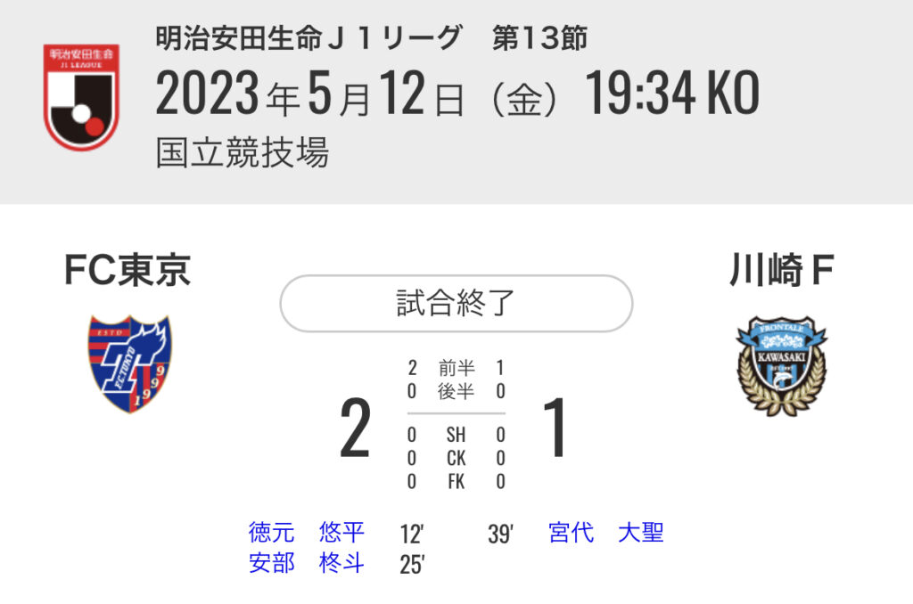 1: 久太郎 ★ 2023/05/12(金) 21:33:13.58 ID:7FXf81gG9 FC東京 2-1 川崎 [得点者] 12'徳元 悠平(FC東京) 25'安部 柊斗(FC東京) 39'宮代 大聖(川崎) スタジアム:国立競技場 入場者数:56,705人 https://www.jleague.jp/match/j1/2023/051201... -