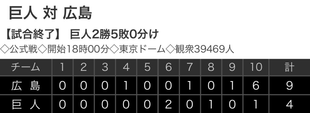 1: 鉄チーズ烏 ★ 2023/05/12(金) 21:50:21.36 ID:XoYkTHdk9 広島 0 0 0 1 0 0 1 0 1 6 |9 巨人 0 0 0 0 0 2 0 1 0 1 |4 【バッテリー】 (広)大瀬良、ターリー、矢崎、大道 - 坂倉 (巨)横川、直江、大江、高梨、大... -