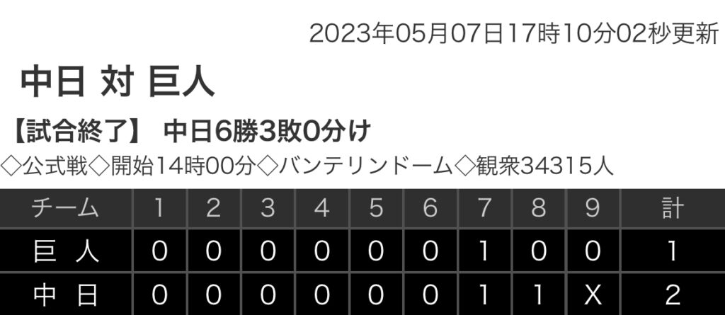 1: 鉄チーズ烏 ★ 2023/05/07(日) 16:59:23.20 ID:Uxe5YjUG9 巨人 0 0 0 0 0 0 1 0 0 |1 中日 0 0 0 0 0 0 1 1 X |2 【バッテリー】 (巨)赤星、高梨、直江、大江、菊地 - 大城卓 (中)高橋宏、福、田島、マルティネス -... -
