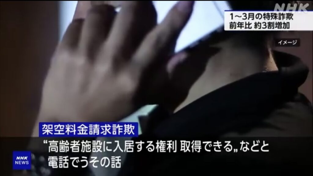 1: 香味焙煎 ★ 2023/05/07(日) 06:41:09.16 ID:TxmD0COW9 ことしに入ってから3か月間の特殊詐欺の発生件数が、去年の同じ時期に比べておよそ3割増え、特に高齢者をねらった架空料金請求詐欺などが増えていることから、警察庁が注意を呼びかけています。 警... -