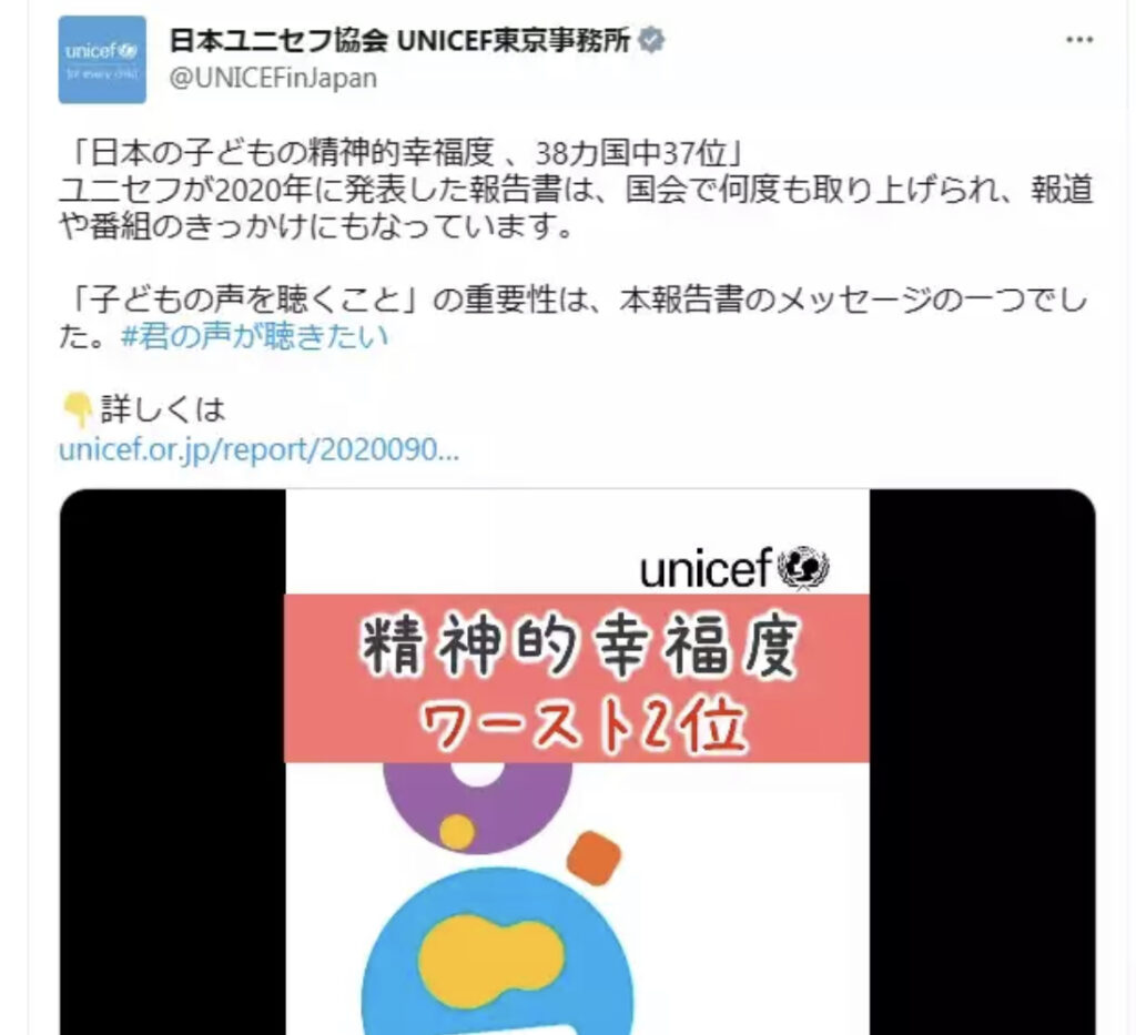 日本ユニセフ協会 「日本の子どもの精神的幸福度は38カ国中37位です」