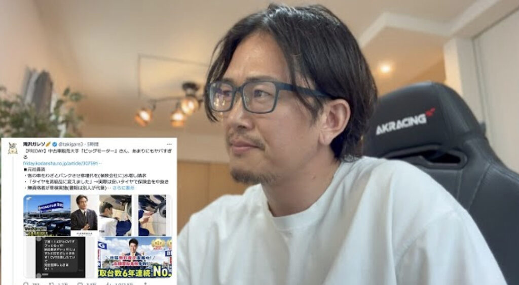 “ビッグモーター元No.1営業”YouTuberが不正暴露「不正に反対する社員は全員辞めた」「年収1000万超えて、家族のために仕方なく」
