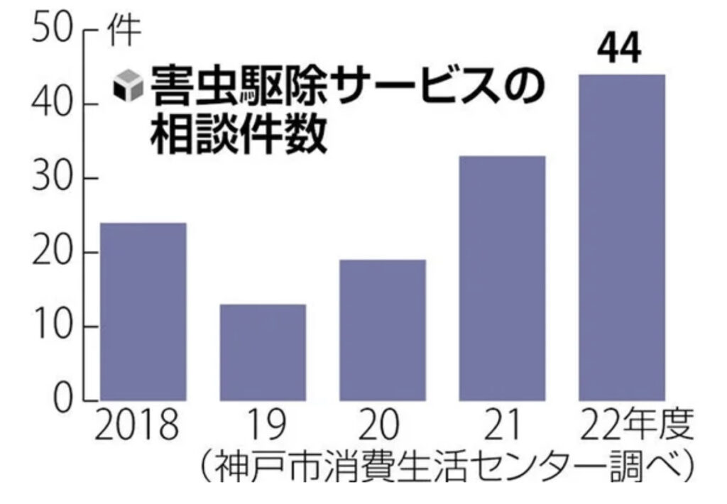 1: ぐれ ★ 2023/05/01(月) 16:25:17.82 ID:F6qpX1Tz9 >>2023/04/30 08:59 読売新聞 ハチやゴキブリなどの駆除業者から、想定外の高額料金を請求されたという苦情相談が急増している。神戸市消費生活センターによると、相談件数は2022年度は44... -