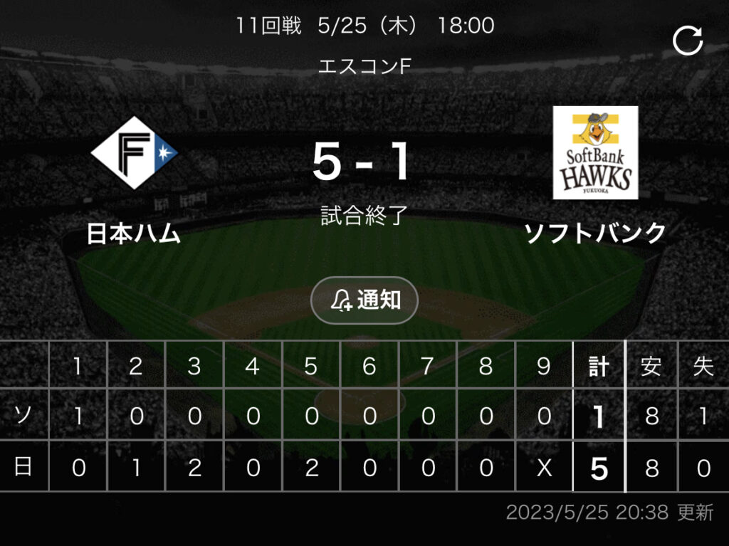 1: 鉄チーズ烏 ★ 2023/05/25(木) 20:35:50.41 ID:qf/u5xLd9 ソフトバンク . 1 0 0 0 0 0 0 0 0|1 日本ハム 0 1 2 0 2 0 0 0 X|5 【バッテリー】 (ソ)ガンケル、泉、板東、松本裕 - 嶺井、谷川原 (日)加藤貴、ロド... -
