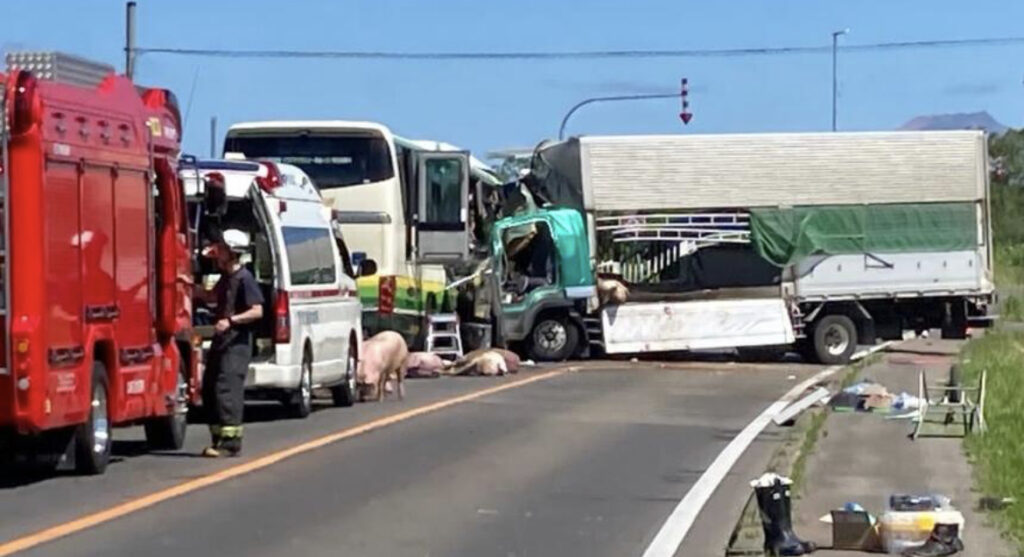 高速バスとトラックが衝突 15人けが そのうち2人~3人が心肺停止 トラックに積まれていたブタも逃げ出す 北海道八雲町