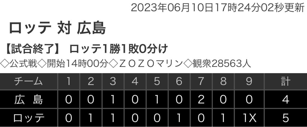1: 鉄チーズ烏 ★ 2023/06/10(土) 17:24:42.36 ID:CGGTbAB/9 広島. 0 0 1 0 1 0 2 0 0 |4 ロッテ 0 1 1 0 0 1 0 1 1X|5 【バッテリー】 (広)森下、ターリー、栗林 - 會澤、坂倉 (ロ)本前、東妻、西村、横山、益田... -