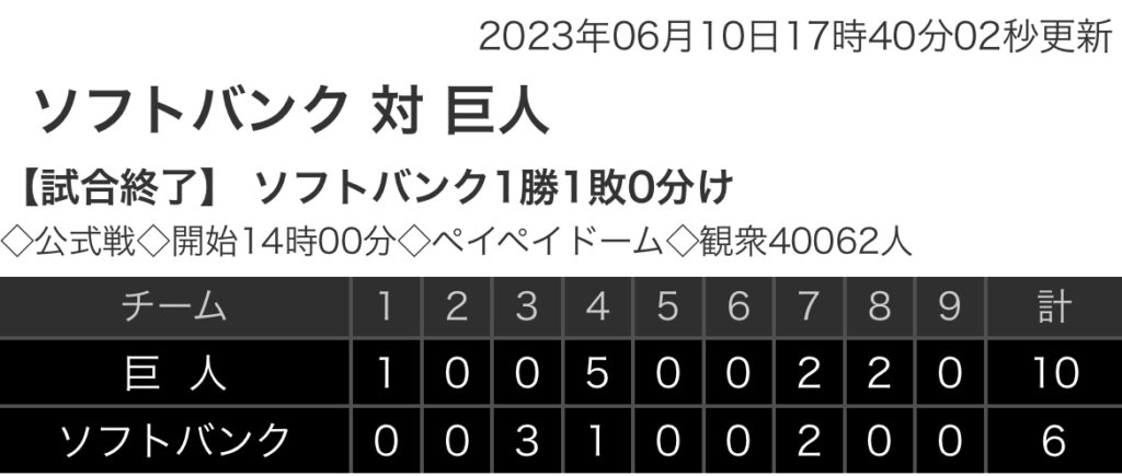 1: 鉄チーズ烏 ★ 2023/06/10(土) 17:38:11.20 ID:CGGTbAB/9 巨人. 1 0 0 5 0 0 2 2 0|10 ソフトバンク 0 0 3 1 0 0 2 0 0| 6 【バッテリー】 (巨)今村、大江、菊地、高梨、鈴木康、中川、大勢 - 大城卓、小林... -