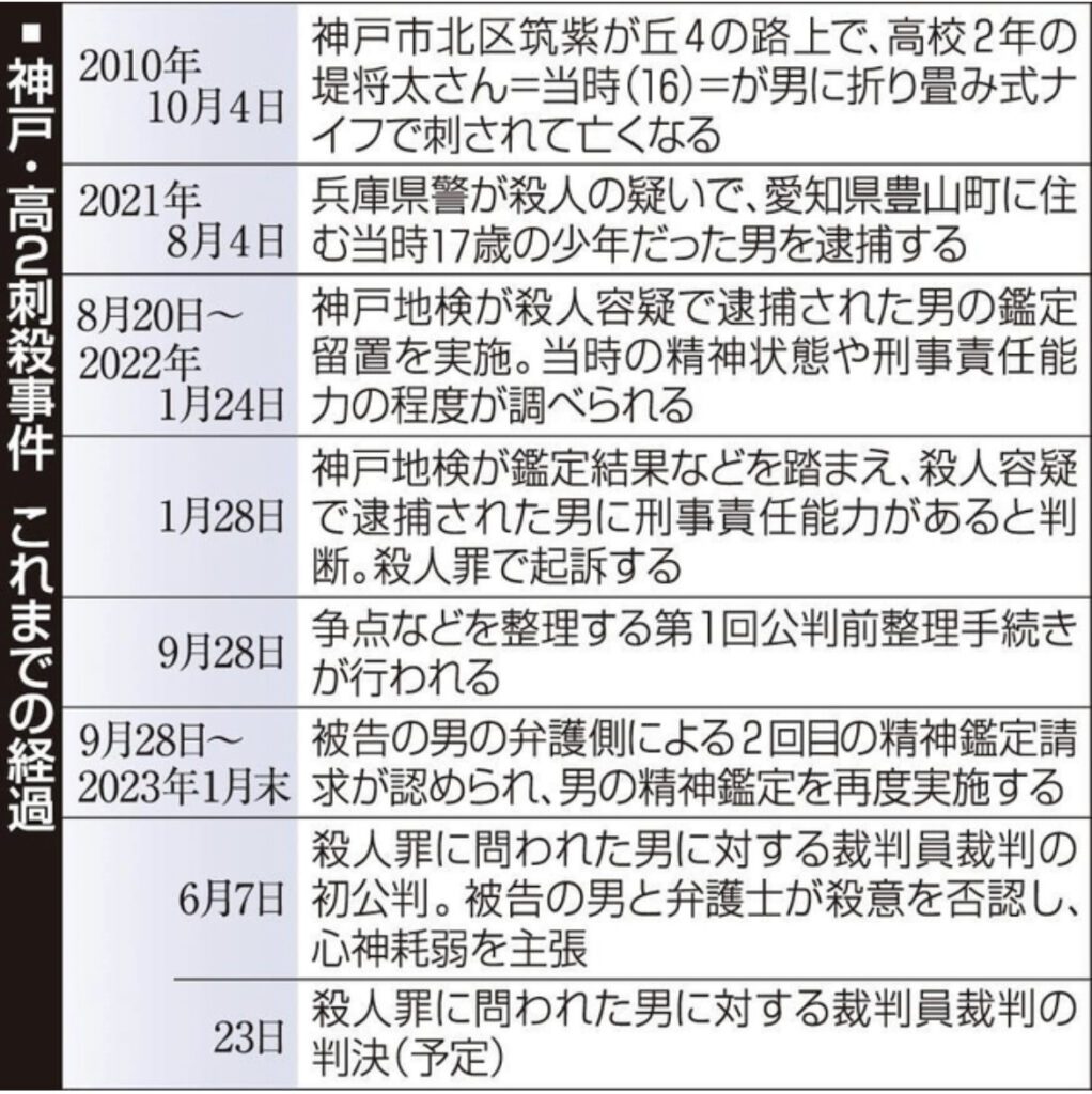 1: おっさん友の会 ★ 2023/06/09(金) 18:35:12.15 ID:t9BQgv6c9 神戸市北区の路上で2010年10月、高校2年の堤将太さん=当時(16)=が刺殺された事件で 殺人罪で起訴された当時17歳の男(30)に対する裁判員裁判の第3回公判が9日午前、神戸...