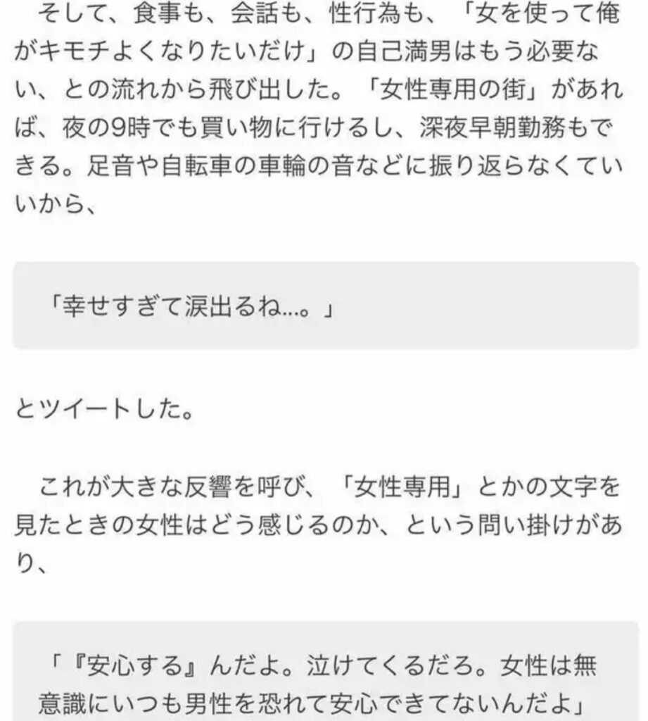 1: ウンブリエル(SB-iPhone) [US] 2023/06/02(金) 20:29:28.82 ID:KqdrMtdK0● BE:659060378-2BP(8000) sssp://img.5ch.net/ico/jisakujien_5.gif 女性が性犯罪に悩まなくて済む「女性専用の街」 を女性がTwitterで提案し、大きな話題となっている。 この女... -