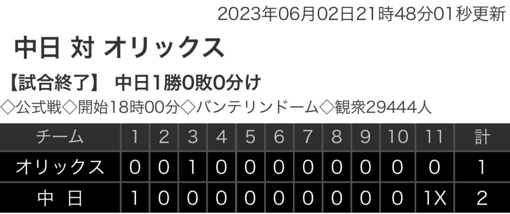 1: 鉄チーズ烏 ★ 2023/06/02(金) 21:49:14.20 ID:yZBjc5Sd9 オリックス. 0 0 1 0 0 0 0 0 0 0 0 |1 中日 1 0 0 0 0 0 0 0 0 0 1X |2 【バッテリー】 (オ)山岡、比嘉、山田、阿部、本田、ワゲスパック ... -