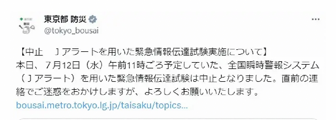 防衛省は午前10時ごろ、北朝鮮から弾道ミサイルの可能性があるものが発射されたと発表しました。それに伴い、消防庁は7月12日午前11時に予定していたJアラート全国一斉伝達試験を中止する旨を伝えています。