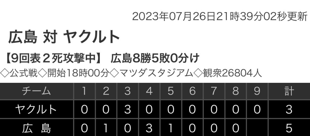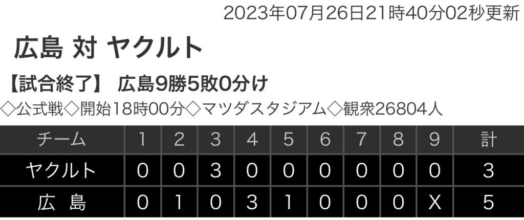 1: 鉄チーズ烏 ★ 2023/07/26(水) 21:38:54.34 ID:SicEeEnc9 ヤクルト 0 0 3 0 0 0 0 0 0 |3 広島 0 1 0 3 1 0 0 0 X |5 【バッテリー】 (ヤ)高橋、木澤、今野、尾仲 - 中村 (広)森、大道、栗林、中﨑、島内、矢崎... -