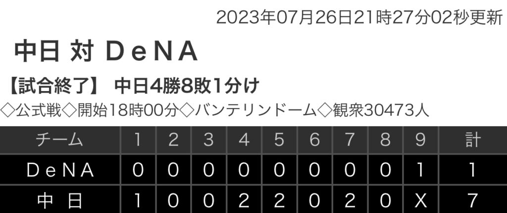 1: 鉄チーズ烏 ★ 2023/07/26(水) 21:18:56.58 ID:SicEeEnc9 DeNA 0 0 0 0 0 0 0 0 1 |1 中日 1 0 0 2 2 0 2 0 X |7 【バッテリー】 (De)ガゼルマン、石川、上茶谷、坂本 - 伊藤、山本 (中) 仲地、齋藤、藤嶋... -