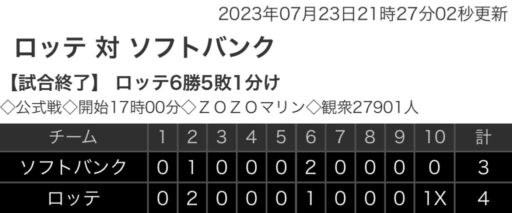 1: 鉄チーズ烏 ★ 2023/07/23(日) 21:16:46.25 ID:DurmKCyb9 ソフトバンク 0 1 0 0 0 2 0 0 0 0 |3 ロッテ 0 2 0 0 0 1 0 0 0 1X|4 【バッテリー】 (ソ)板東、田浦、大津、甲斐野、松本裕、オスナ、津... -