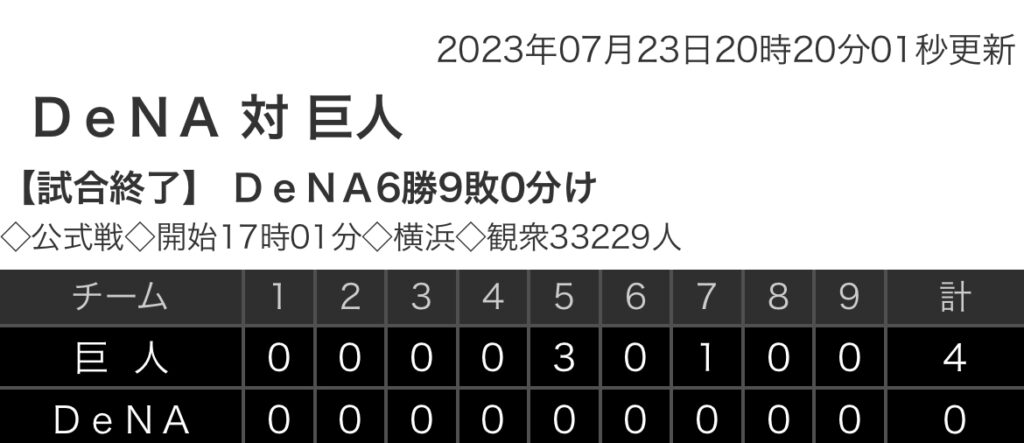 【野球】セ・リーグ DB 0-4 G [7/23] 巨人連勝 吉川6号先制2ラン、秋広10号HR、メンデス7回無失点 DeNA完封負け5連敗