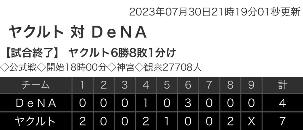 1: 鉄チーズ烏 ★ 2023/07/30(日) 21:18:39.60 ID:O2Jz6bn39 DeNA.. 0 0 0 1 0 3 0 0 0 |4 ヤクルト 2 0 0 2 1 0 0 2 x |7 【バッテリー】 (De)石田、上茶谷、山﨑、伊勢、石川 - 戸柱 (ヤ) 小澤、山本、石山、...