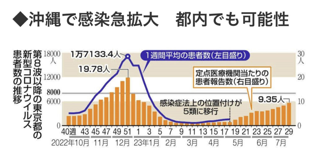 1: おっさん友の会 ★ 2023/07/30(日) 21:36:00.65 ID:+DQK3xol9 猛暑が続く東京都内で、新型コロナウイルスの感染がじわりと拡大している。 感染症の専門家は感染状況を「(感染が急拡大した)昨年11月ごろの第8波の入り口と同規模だ」と説明。 これまでと... -