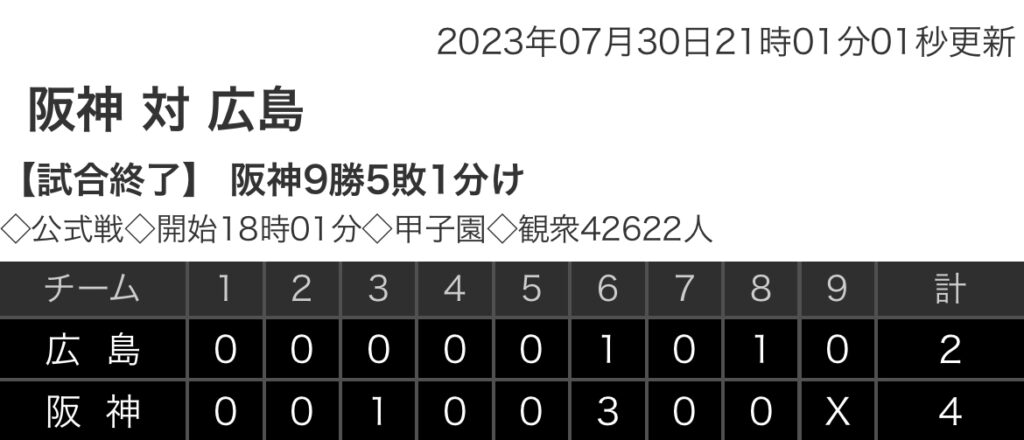 1: 鉄チーズ烏 ★ 2023/07/30(日) 21:00:24.88 ID:O2Jz6bn39 広島 0 0 0 0 0 1 0 1 0 |2 阪神 0 0 1 0 0 3 0 0 x |4 【バッテリー】 (広)大瀬良、中﨑、ケムナ - 坂倉 (阪)伊藤将、加治屋、島本、岩崎 - 梅野 【本塁打... -