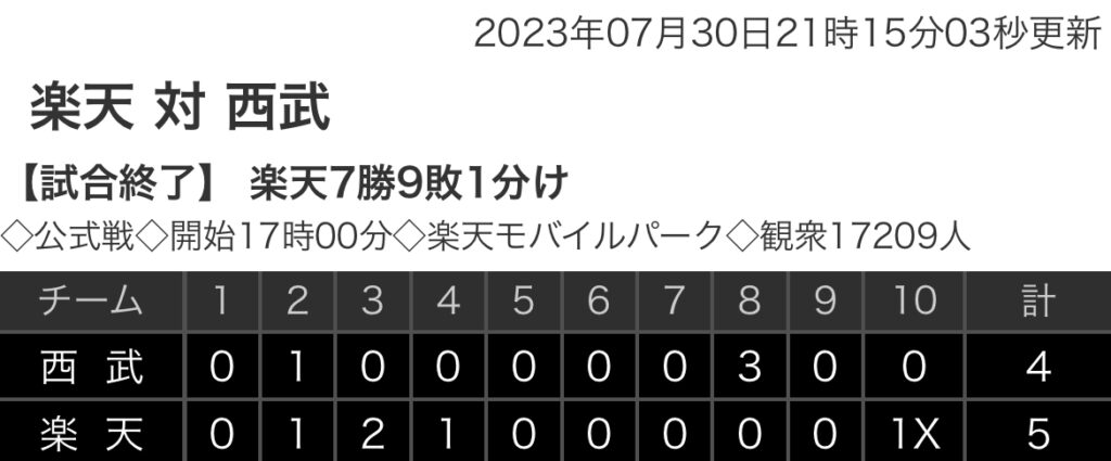 1: 鉄チーズ烏 ★ 2023/07/30(日) 21:13:44.60 ID:O2Jz6bn39 西武 0 1 0 0 0 0 0 3 0 0 |4 楽天 0 1 2 1 0 0 0 0 0 1x|5 【バッテリー】 (西)隅田、ティノコ、ボー・タカハシ、佐藤隼、平井、増田、水上 - 古賀 ... -
