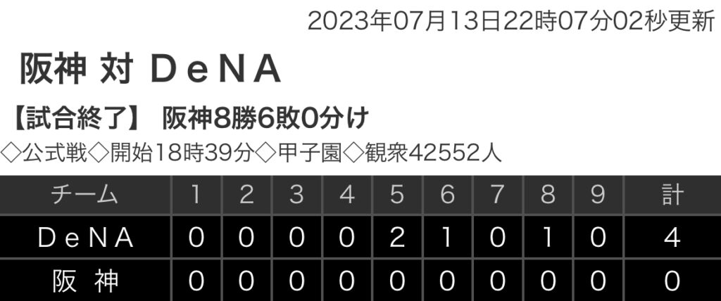 1: 鉄チーズ烏 ★ 2023/07/13(木) 22:07:34.81 ID:gV8ymeqL9 DeNA 0 0 0 0 2 1 0 1 0 |4 阪神 0 0 0 0 0 0 0 0 0 |0 【バッテリー】 (De)石田、森原、ウェンデルケン、伊勢、山﨑 - 山本 (阪) 村上、及川、石... -