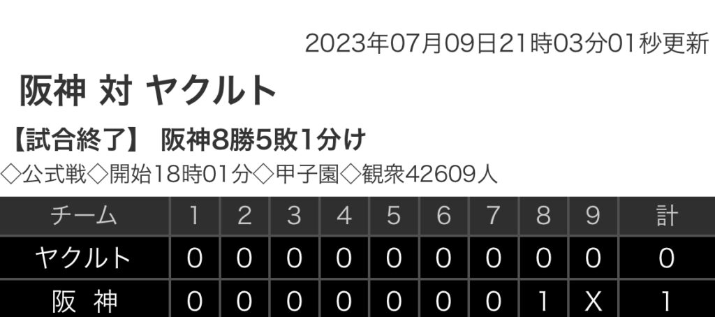 1: 鉄チーズ烏 ★ 2023/07/09(日) 20:54:26.30 ID:fzfiwAOF9 ヤクルト 0 0 0 0 0 0 0 0 0 |0 阪神 0 0 0 0 0 0 0 1 X |1 【バッテリー】 (ヤ)高橋、大西、木澤 - 中村 (阪)西純、岩貞、岩崎 - 梅野 【本塁打】 (... -