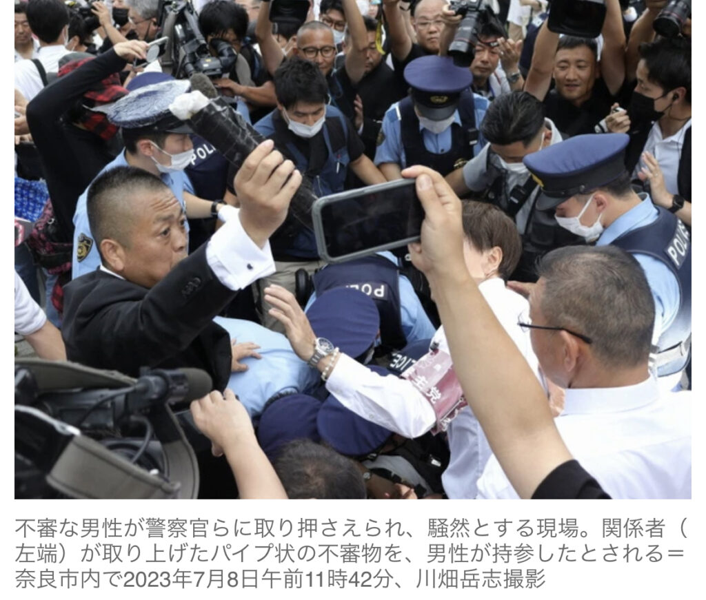 1: 首都圏の虎 ★ 2023/07/08(土) 12:15:50.01 ID:sK3i5RWR9 8日午前11時30分頃、安倍晋三・元首相が銃撃された奈良市の近鉄大和西大寺駅前に設けられた献花台近くでは、銃のようなものを持った若い男数人が現れ、周囲で警戒していた警察官に取り押... -