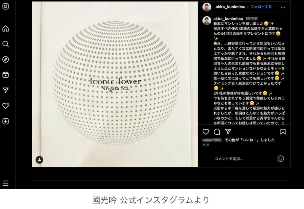 1: ネギうどん ★ 2023/07/29(土) 11:44:12.16 ID:P6UMEkwU9 女優の國光真耶(旧芸名:小林麻耶/以下、麻耶)と、夫でタレントの國光吟氏が7月19日、インスタグラムで新潟県に新築マンションを購入したことを報告。これと同時に投稿した画像が、一部ネッ... -
