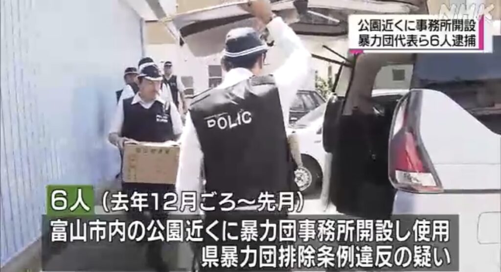 1: スコティッシュフォールド(東京都) [ニダ] 2023/07/28(金) 20:23:46.83 ID:Zl8OHBO60● BE:866556825-PLT(21500) 富山市で公園の近くに暴力団の事務所を開設したとして代表など6人が県の暴力団排除条例違反の疑いで逮捕されました。 逮捕されたのは、六... -