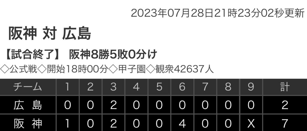1: 鉄チーズ烏 ★ 2023/07/28(金) 21:21:46.21 ID:heoBWY+Z9 広島 0 0 2 0 0 0 0 0 0 |2 阪神 1 0 2 0 0 4 0 0 X |7 【バッテリー】 (広)野村、ケムナ、戸根、大道 - 坂倉 (阪)村上、岩貞、加治屋 - 坂本 【本塁打】 ...
