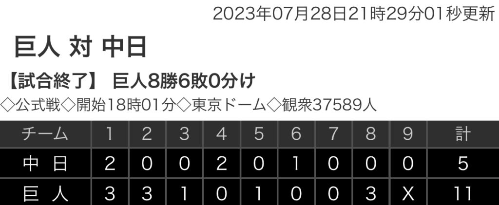 【野球】セ・リーグ G 11-5 D [7/28] 巨人連勝 復帰の坂本右左中3安打3打点、船越プロ初勝利 中日・涌井11敗目