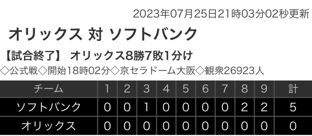 1: 鉄チーズ烏 ★ 2023/07/25(火) 21:01:13.95 ID:KHw6Bexh9 ソフトバンク. 0 0 1 0 0 0 0 2 2|5 オリックス 0 0 0 0 0 0 0 0 0|0 【バッテリー】 (ソ)有原 - 甲斐 (オ)山本、山田、小野 - 若月 【本塁打】 (ソ) ... -