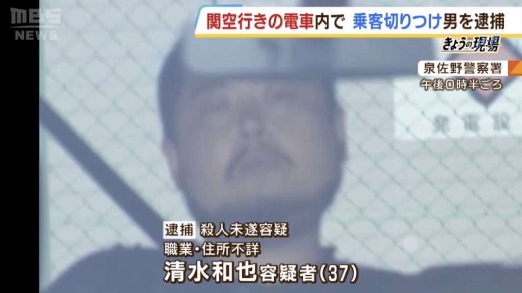 1: 夜のけいちゃん ★ 2023/07/24(月) 18:33:44.28 ID:ZN2GHrlu9 7/24(月) 17:55配信 MBSニュース 7月23日、関西空港行きのJRの車内で乗客ら3人が男に切りつけられてけがをする事件が起きました。 りんくうタウン駅のホームにあぐらをかいて座りこむ... -