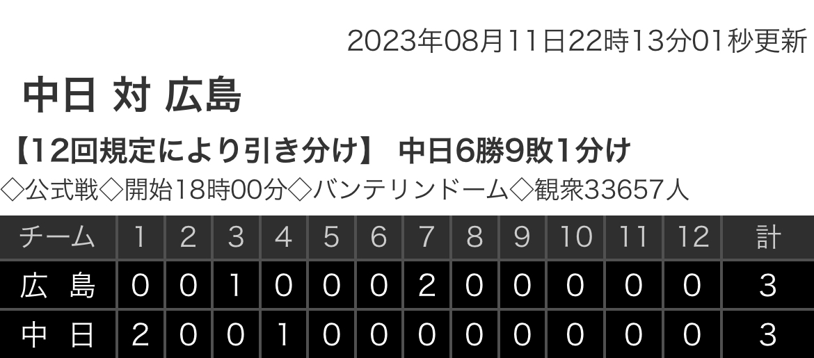 引用元: ・【野球】セ・リーグ D 3-3 C [8/11] 中日-広島は延長12回引き分け どちらも連敗脱出ならず [鉄チーズ烏★]