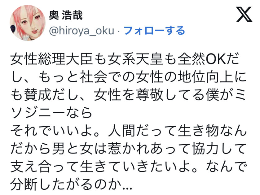 奥さんは12日午前、「ああ…フェミの人達に見つかってしまった…面倒くさい…」と投稿。「女性総理大臣も女系天皇も全然OKだし、もっと社会での女性の地位向上にも賛成だし、女性を尊敬してる僕がミソジニーならそれでいいよ」と反論している。