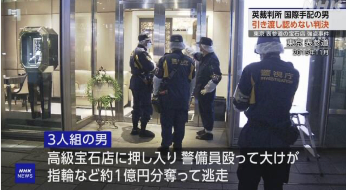2015年11月、東京・渋谷区の高級宝石店に3人組の男が押し入り、警備員を殴って大けがをさせた上、ダイヤの指輪などおよそ1億円分を奪って逃げました。